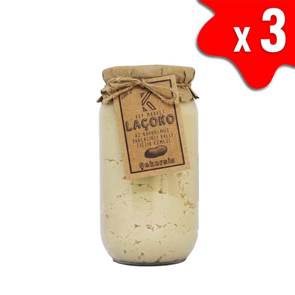 LAÇOKO 1 KG * 3 LÜ Şekersiz, Katkısız, Glutensiz, Vegan, Doğal Az Kavrulmuş (ÇİĞ) Parçacıklı Extra Crunchy Yer Fıstığı Ezmesi (3KG)